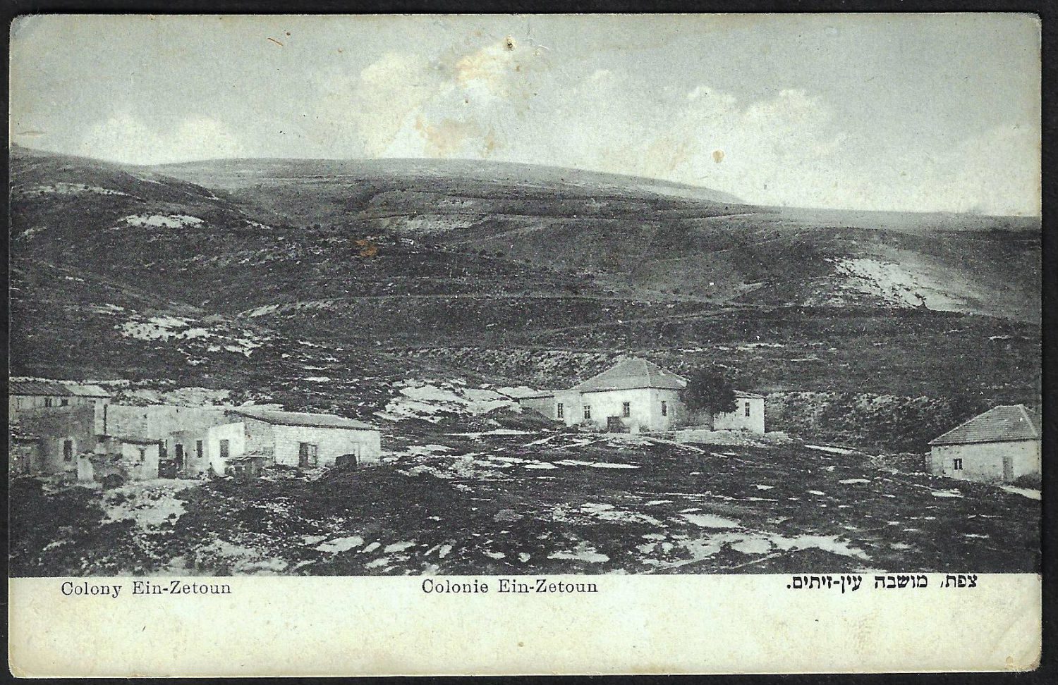 עין זיתים גלויה של מושבה עין זיתים ליד צפת, הוצאה נדירה ביותר, בלתי מחולקת, הוצאת טאובנהאוס, רוב הגלויות שיצאו בצפת לפני מלחמת העולם הראשונה – הושמדו מחשש שהמול יואשם בריגול על ידי הטורקים ורק בודדות נותרו. לשעבר מאוס