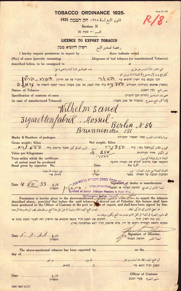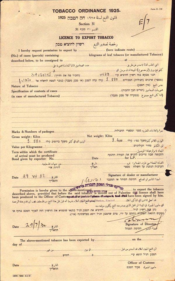 תעודות משלוח של טבק מהמפעל בראש פינה 1932, 1933