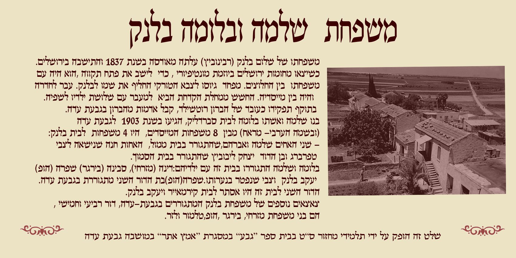 משפחתו של שלום [שולם] בלנק (רבינוביץ) עלתה מאודסה בשנת 1837 והתיישבה בירושלים. היה מראשוני היוצאים מהחומות ומתיישבי פתח תקוה [נחוץ אימות]. מפחד הגיוס לצבא העות'מני החליף שמו לבלנק. עבר לחדרה והיה בין מייסדיה. החשש ממחלת הקדחת הביא למעבר המשפחה לזכרון יעקב וכאן נולדה בתם חנה. היו מראשוני המתיישבים במושבה מאיר שפיה. בלנק קיבל מפקידות הברון אדמות במארח' [גבעת עדה] וכל צאצאיו עברו לשם עם המייסדים הראשונים בשנת 1903.
