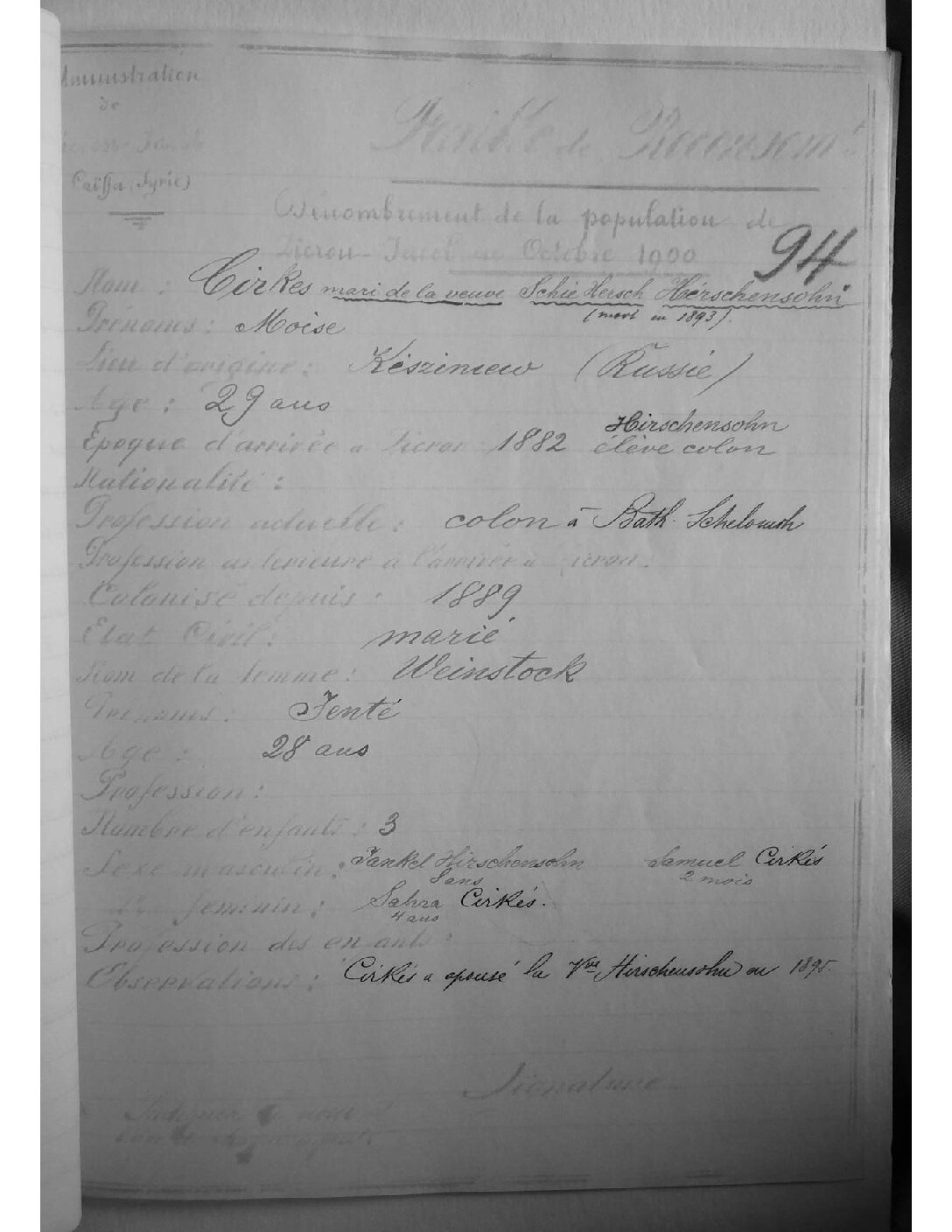 שם המשפחה בספר זכרון יעקב מופיע סירקוס, ועל אבן המצבה סירקיס