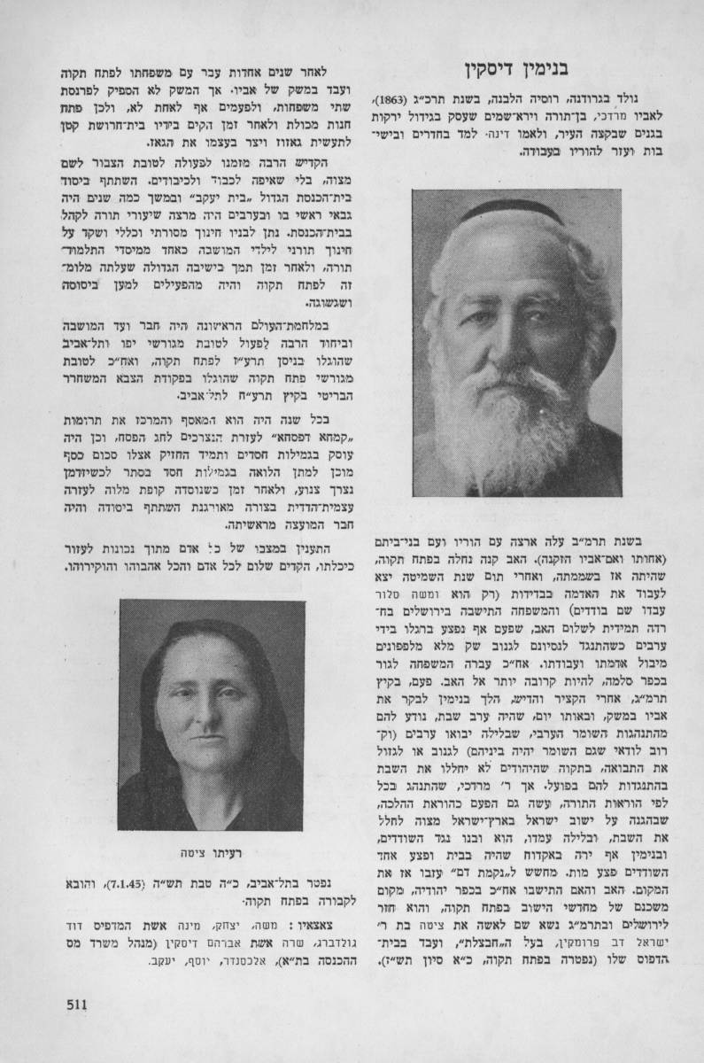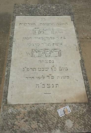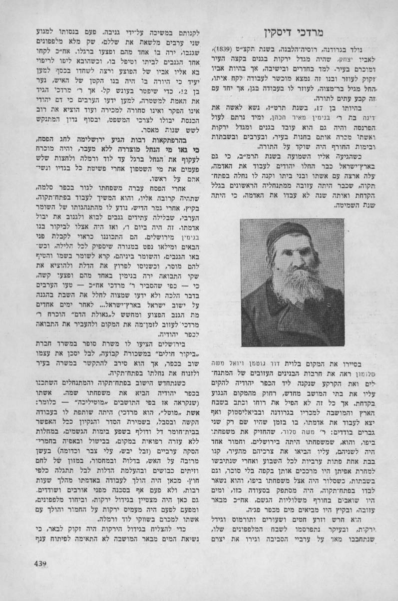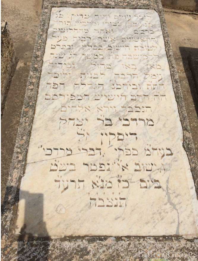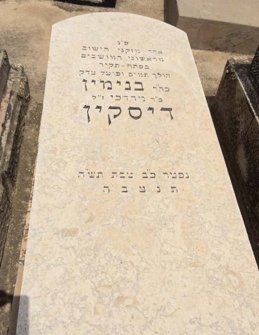 לזכר עולם יהיה צדיק פנ' פנ' עסקן צבורי ומרביץ תורה ברבים ואחד מהחלוצים הראשונים אשר רבות פעל לטובת הישוב בכלל ובפרט להמושבה פ"ת במשך ל"ג שנה מאז באו מחו"ל וביהוה עמל הרבה לבנות וליסד הת"ת וביהכ"נ הגדלה דפה ה"ה הרב הישיש המפורסם הנכבד הירא אלהים מרדכי ב"ר יצחק דיסקין ז"ל בעה"מ ספרי "דברי מרדכי" ו"ישוב א"י", נפטר בש"ט ביום כ"ז מנ"א תרע"ד תנצב"ה