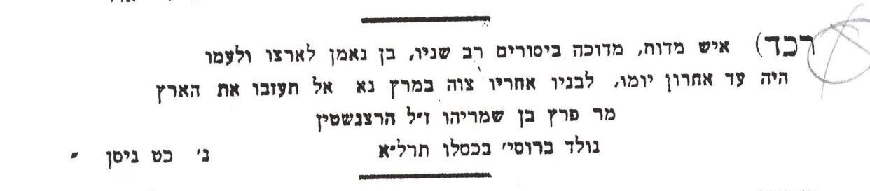 אבן המצבה שלו בבית העלמין זכרון יעקב מכילה דרישה מפורשת מבניו שלא לעזוב את הארץ, בפועל כולם היגרו לארה"ב…