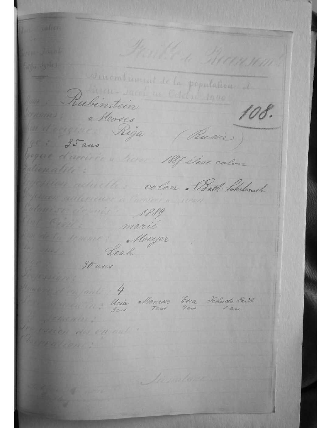 משה , חניך בארבייטער שולה , בית הספר להכשרה חקלאית שהקים הברון רוטשילד בזיכרון יעקב. אשתו , לאה לבית מאיר נולדה בשנת 1870 . ב1902 עזבו לארה"ב .