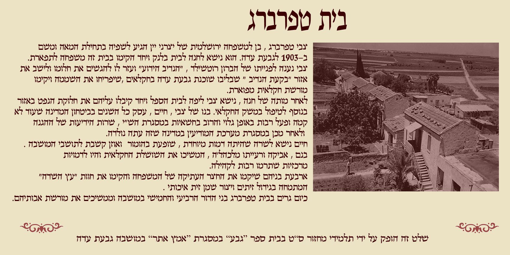 אברהם טפרברג הגיע מאודסה לירושלים וייסד בה את יקב טפרברג. נכדו צבי חבר לברון רוטשילד בעזרתו עבר לזכרון יעקב ומשם לשפיה, ממנה ב-1903 למארח' לימים גבעת עדה. צבי היה אחראי על חלוקת נפט במושבה. אשתו חנה היא בתם של שלום וסול בלנק ממאיר שפיה, אחותם של שלמה ואברהם בלנק שגם הם היו בין ראשוני המתיישבים בגבעת עדה.